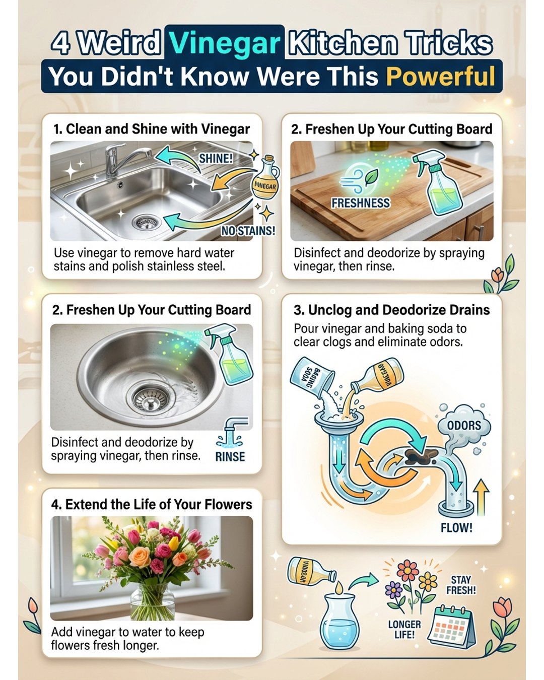 Ever get that nagging feeling your kitchen could be running smoother? Trust meโ€”same. That’s where 4 Weird Vinegar Kitchen Tricks You Didn’t Know Were This Powerful step in and blow your mind. Vinegarโ€™s not just for salads, folks. Next to secret weapon status, right? It can battle burnt pans, tackle odorsโ€”ugh, and even perk up your veggies when you forgot them at the back of the fridge (we’ve all been there). If baking soda crazy tricks make you curious, youโ€™ll want to peek at these weird baking soda kitchen tricks. And honestly, after learning this, youโ€™ll probably rethink your whole cabinet starter packโ€”I sure did! Oh, and donโ€™t sleep on how handy it is compared to dish soap (ICYMI, check this cool dish soap trick article).