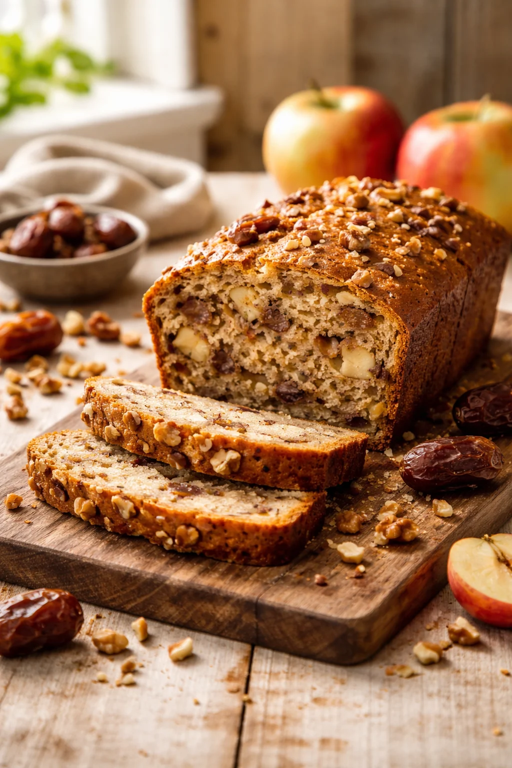 A cozy vegan quick bread made with apples and dates, perfect for a simple treat any time of day.