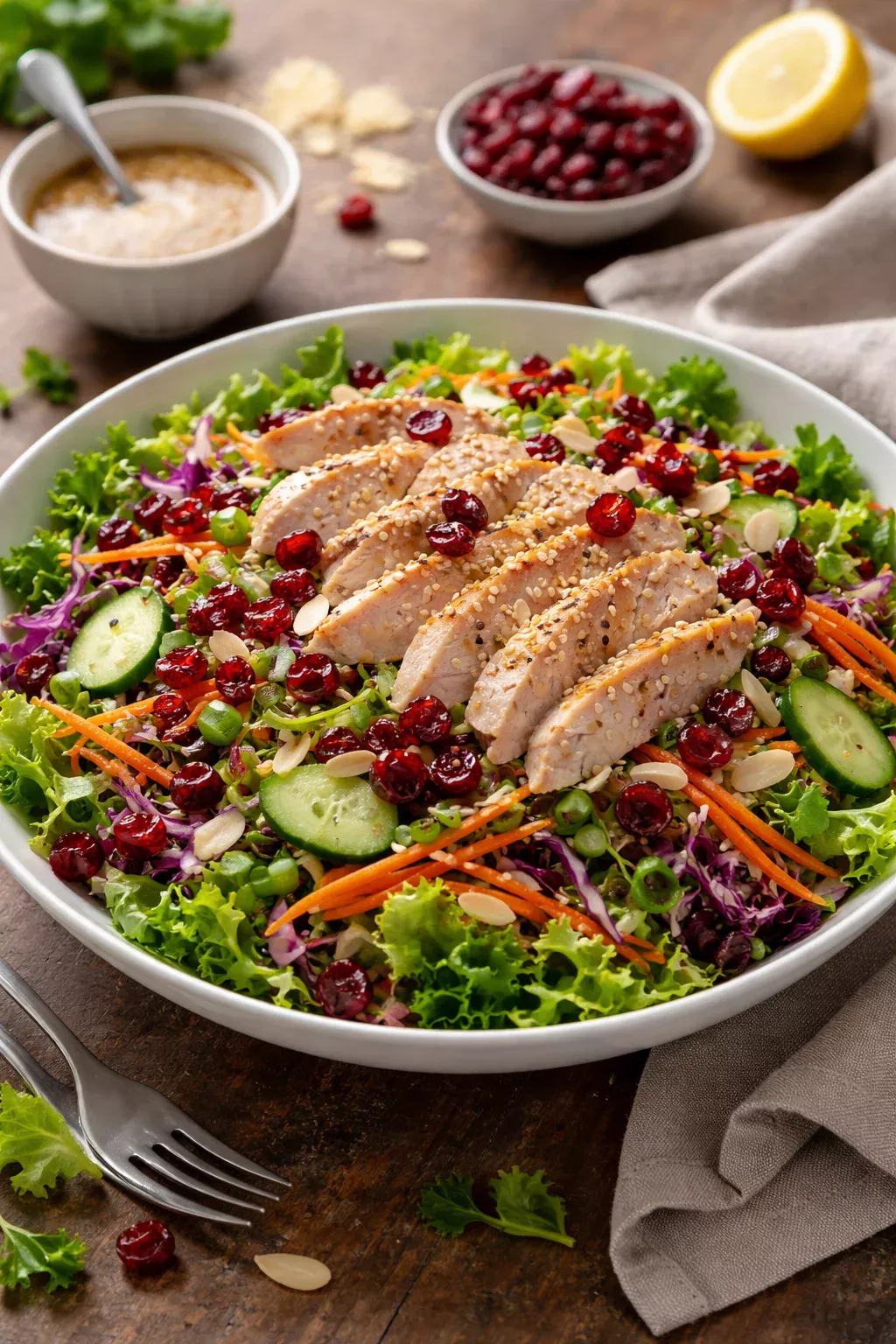 I like to think of this salad as a mix of textures. You get tender chicken, chewy cranberries, crispy greens, and a nice crunch from nuts and cabbage. It is also one of those recipes where you can prep a few things once and then build quick meals for the next couple of days.