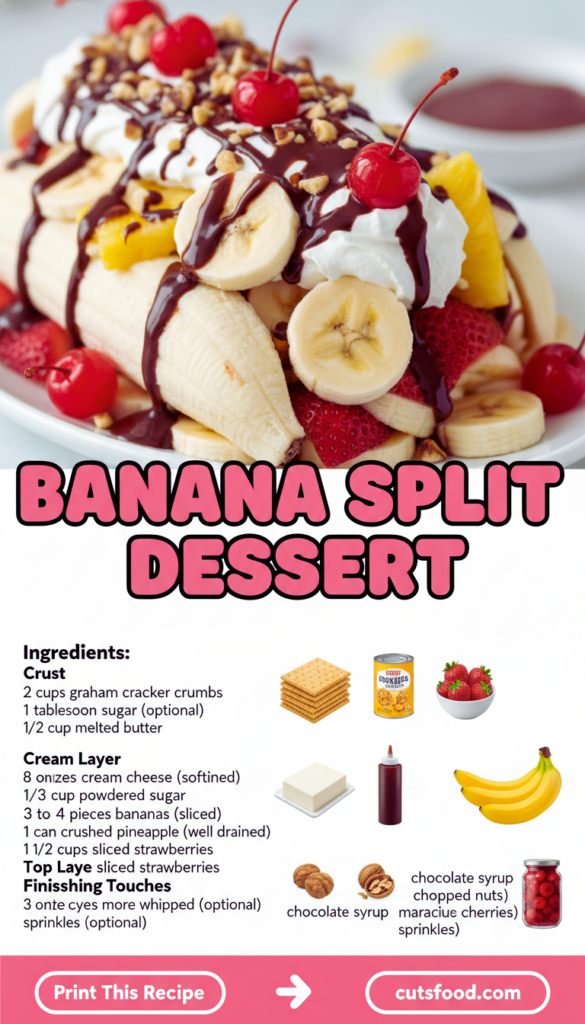 Banana Split Dessert is my go to move when I need something sweet for a get together but I do not want to turn the oven on. You know the situation: you promised to bring dessert, you are short on time, and you still want people to say wow after the first bite. This one hits that perfect spot because it tastes like a classic banana split, but it slices like a chilled treat you can make ahead. It is creamy, fruity, and a little crunchy in all the right places. If you have ripe bananas sitting on the counter, this is your sign.