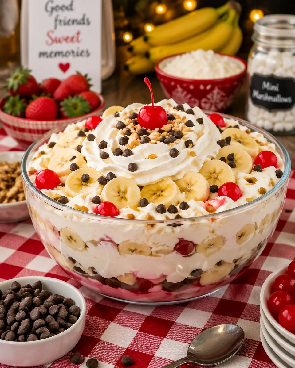 I love this recipe because it uses simple grocery store stuff, and you can mix it up depending on what you have. The basics stay the same: creamy base, banana split flavors, and fun toppings. If you have ever made any kind of fluff salad, you already get the vibe. If not, you are about to become that person who brings the “good bowl” to every get together.