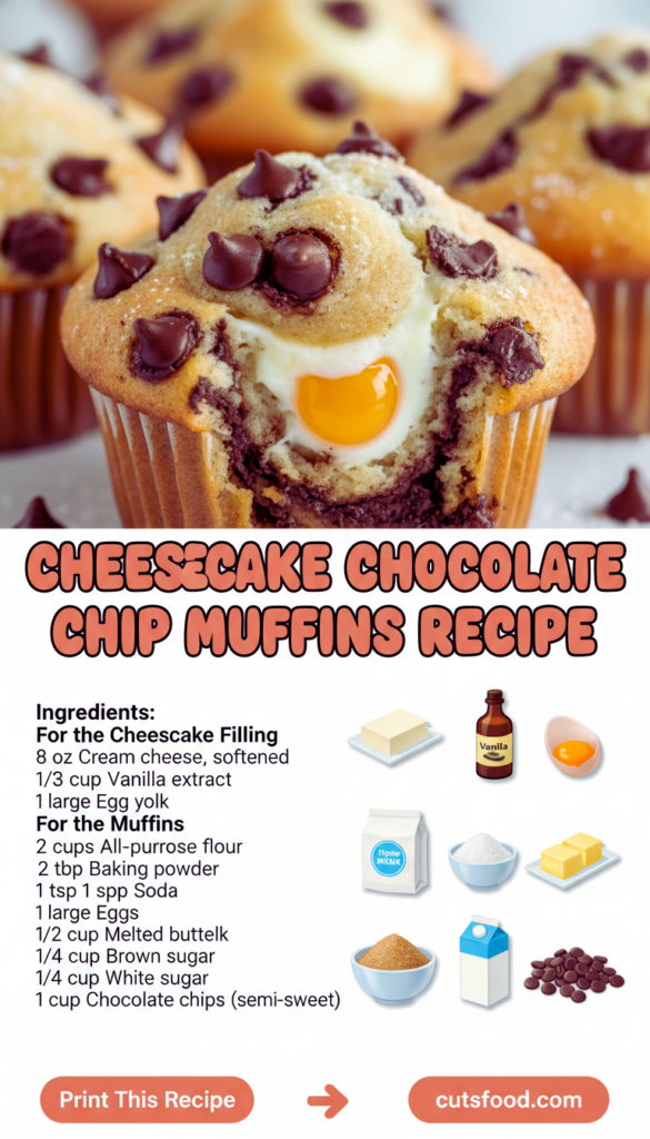 cheesecake chocolate chip muffins Recipe is my go to move when I want something cozy and sweet but I do not feel like baking a whole cake. You know those mornings when coffee alone is not cutting it, and you want a treat that feels a little special? These muffins hit that spot. You get a soft chocolate chip muffin with a creamy cheesecake center that tastes like you stopped at a bakery. The best part is they are totally doable at home with basic ingredients.