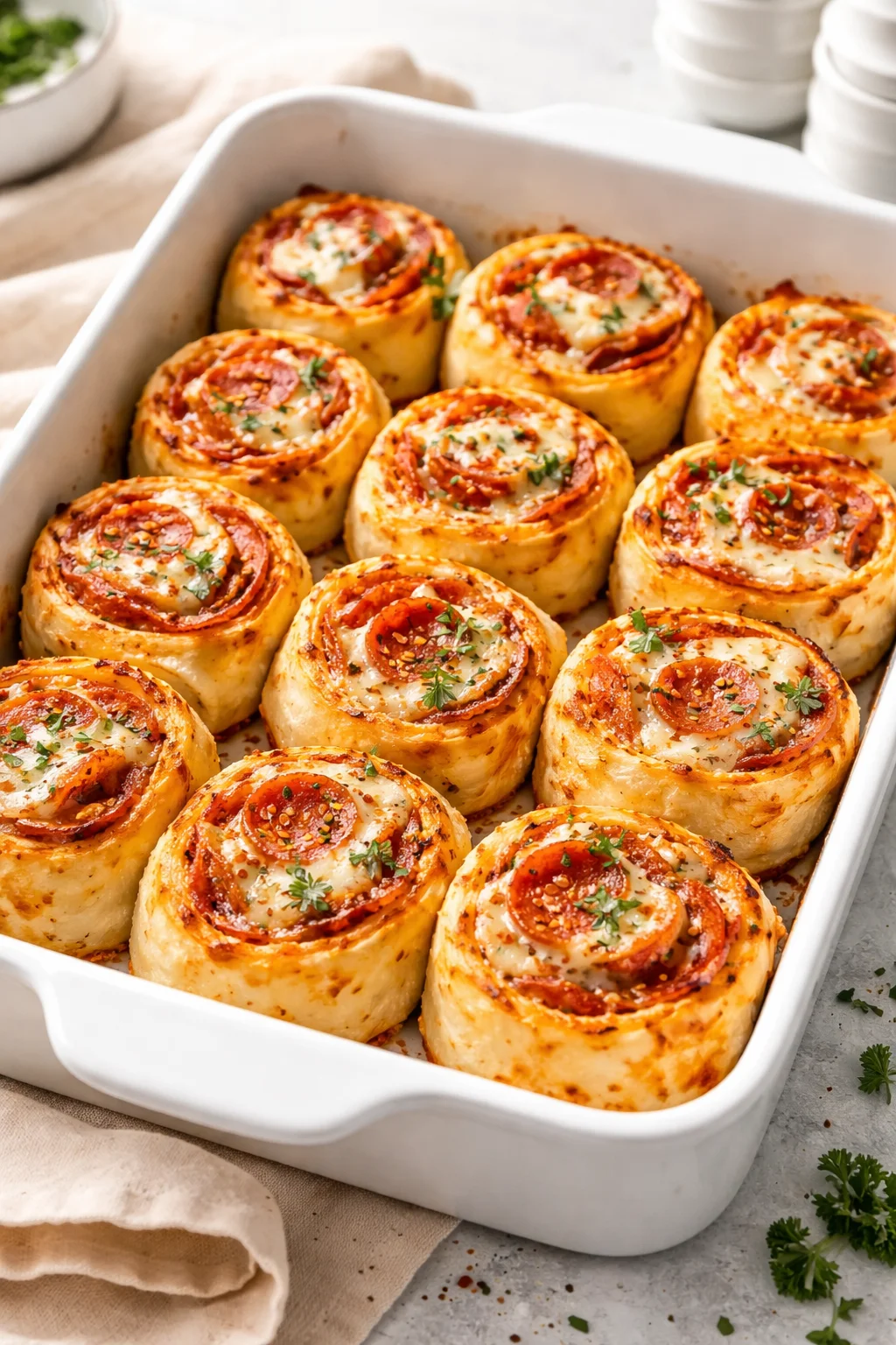 Delicious cheesy pizza pinwheels with mozzarella and pepperoni, baked to perfection.