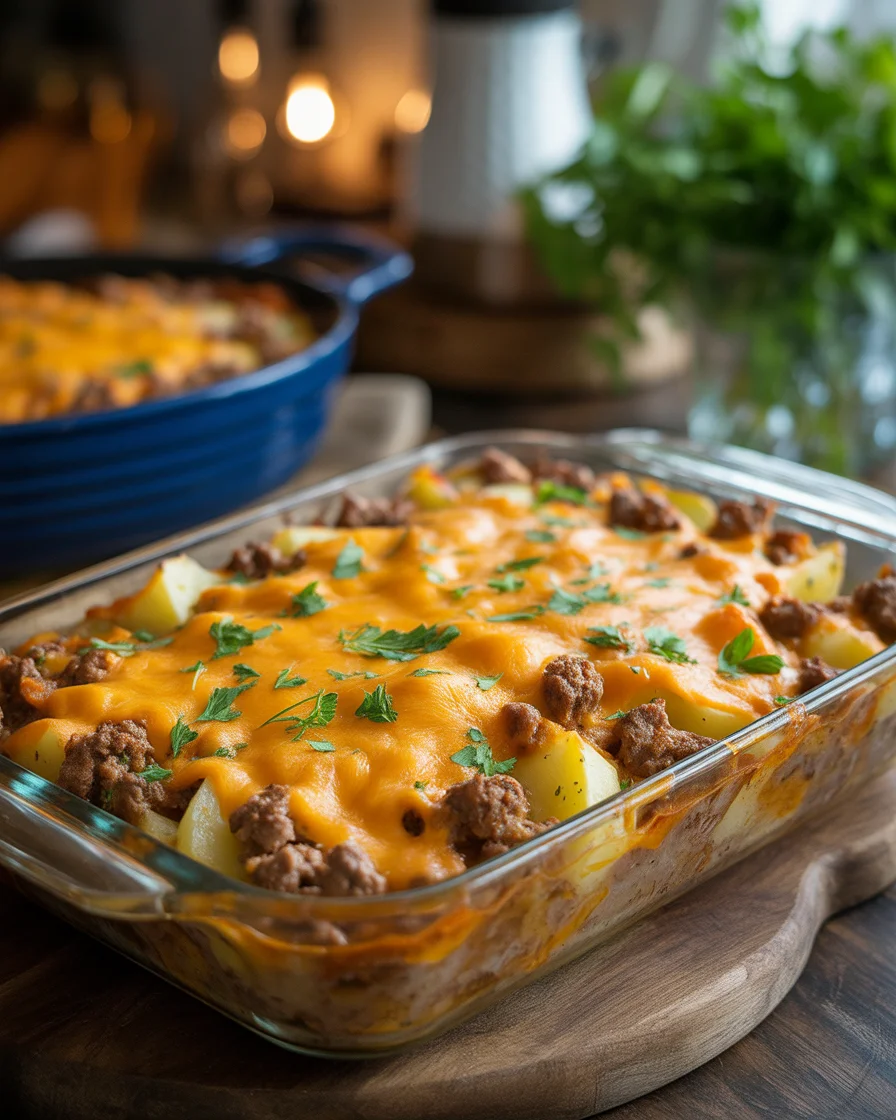 A hearty, creamy, and cozy casserole that combines seasoned ground beef with layers of tender potatoes for a satisfying meal.