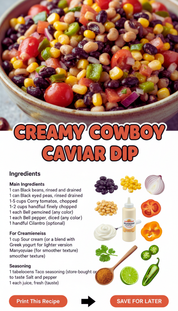 This Creamy Cowboy Caviar dip is one of those recipes that makes you look like you tried way harder than you did. It is creamy, colorful, and easy to tweak for different crowds, and it is just as good as a dip or a taco topping. If you want to compare versions, I found it helpful to look at Creamy Cowboy Caviar Dip | The Butcher’s Wife and Creamy Cowboy Caviar – Lauren’s Latest because they each have their own little twist. Grab a bag of chips, squeeze that lime, and give this a try the next time you need a dependable party bowl. I promise, it is the kind of dip that gets people circling back for “just one more scoop.”