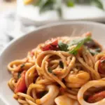 Time for the seafood. I use shrimp, squid rings, scallops, and maybe a handful of mussels if the mood strikes. But honestly, use whatever you can grab, frozen works fine. Pop them into the sauce for only a few minutes—seafood cooks crazy fast. Don’t wander off, or you’ll wind up with rubbery shrimp. When the pasta is ready, lift it right into the pan. Tumble everything together so the sauce hugs every strand, drizzle with fresh parsley and, hey, squeeze of lemon if you like a zippy taste.
