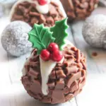Now melt the white chocolate. Spoon or pipe a small blob on the top so it looks like custard dripping down the sides. While the white chocolate is still soft, add your red and green decorations to mimic holly and berries. It’s instant holiday magic. If you’re on a chocolate kick, you’ll also love these chocolate Rice Krispie balls that use a similar base with a different finish.