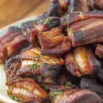 5) Arrange and cook: Spread the pork belly in a single layer, leaving gaps between pieces. Cook at 400 F for 10 minutes. Shake or flip. Cook another 8 to 12 minutes, depending on your air fryer and the size of the cubes. You’re looking for deep golden edges and internal temp around 195 F for ultra tender bites.