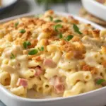 A cozy and cheesy casserole that combines chicken, ham, and Swiss cheese, topped with a crispy crumb finish.