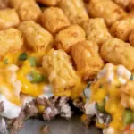 - Breakfast-style: Use breakfast sausage, scrambled eggs, and some diced peppers under the tots.