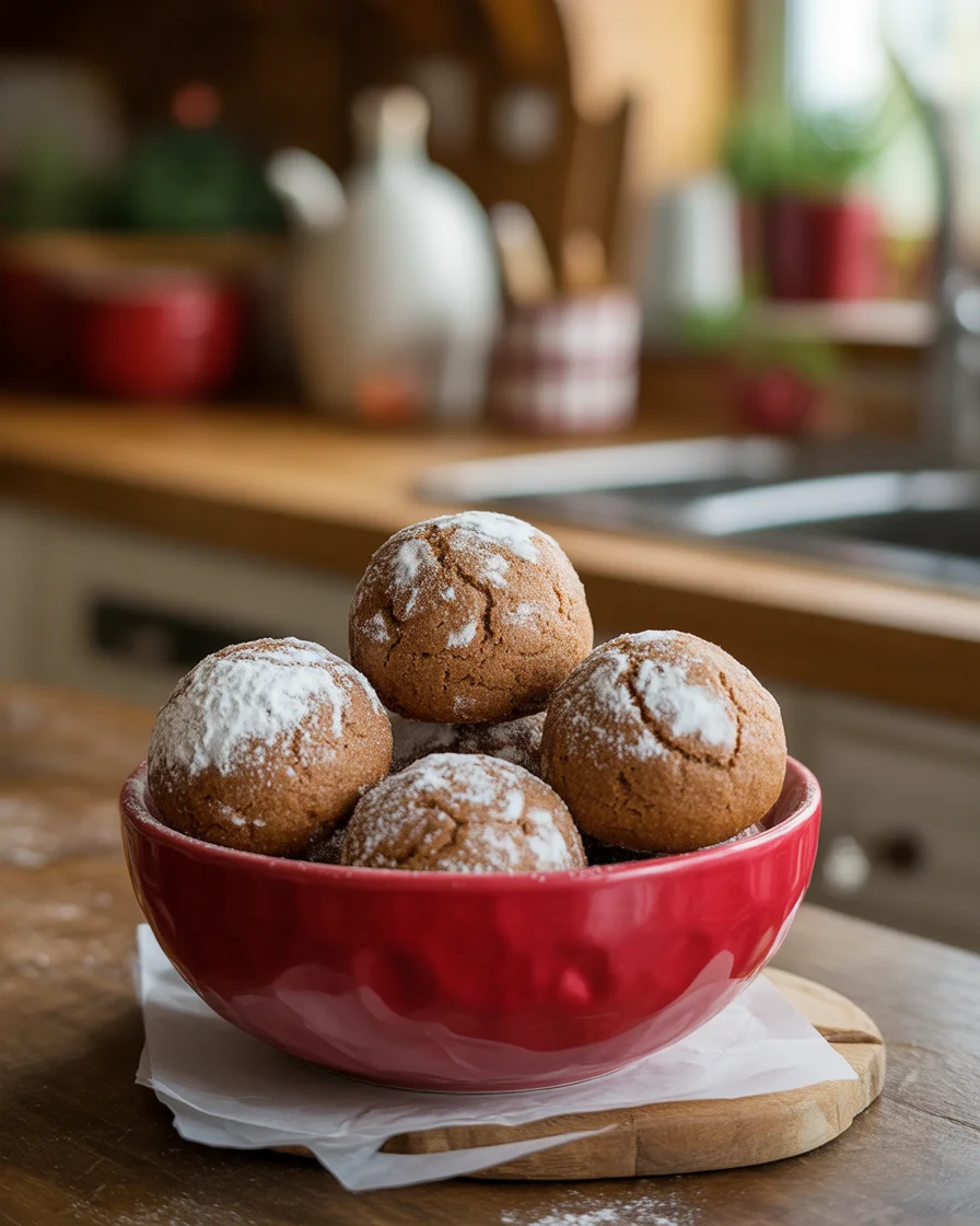 Some cookies are fancy. These aren’t. They are the classic snowball shape with a gingerbread twist, and they’re made to be easy. No chill time if you don’t want it, no icing, and no complicated tools. You mix, scoop, bake, and roll them twice in powdered sugar for that snowy finish. The spiced crumb stays tender for days, which makes them amazing for gifting.