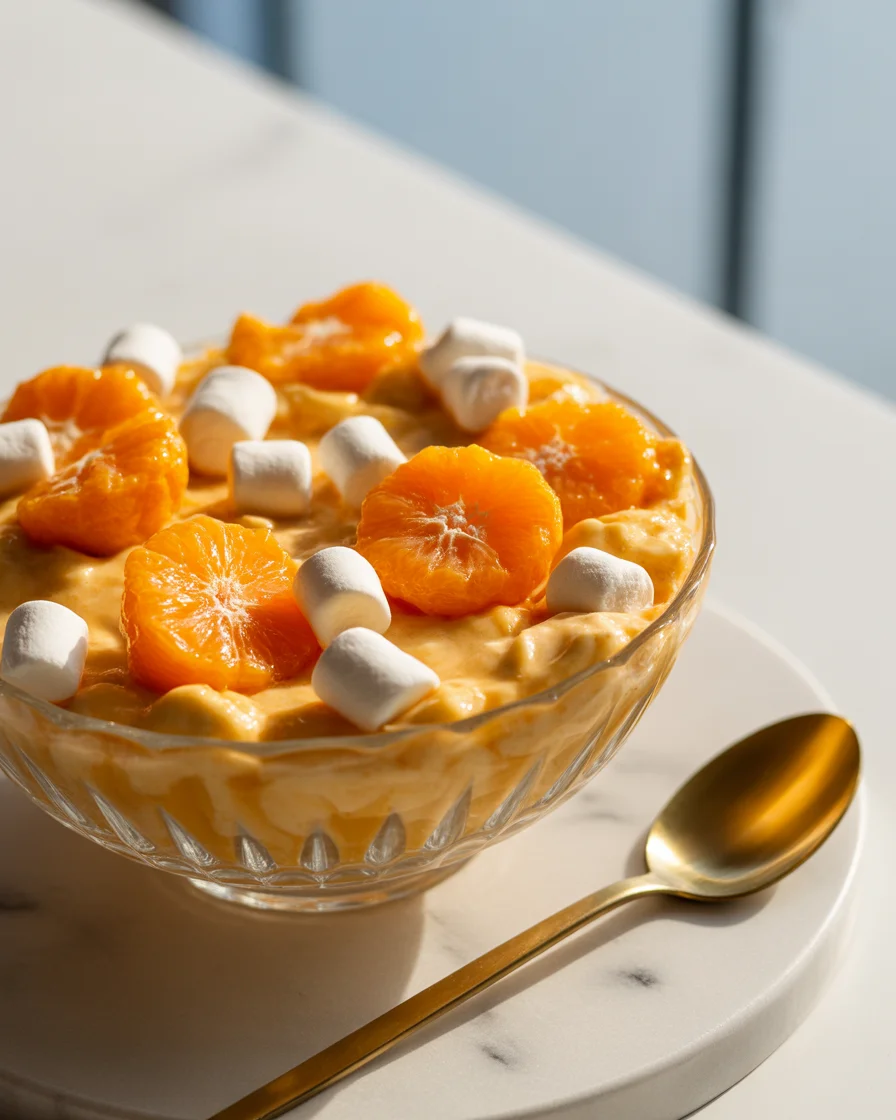 In this case, we’re using orange gelatin plus fluffy vanilla pudding vibes to get that classic creamsicle flavor. The texture is light and cloud-like, with bright pops of juicy mandarin oranges. It’s sweet but not heavy, which explains why it’s a top pick for potlucks and summer cookouts.