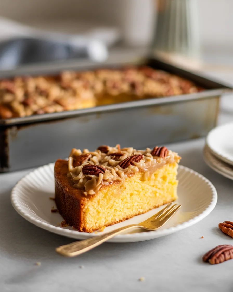 No buttermilk? Mix regular milk with a teaspoon of vinegar and let it sit for 5 minutes. No pecans? Walnuts work. Want it lighter? Use unsweetened coconut in the cake and save the sweetened coconut for the icing. If you’re after a similar nutty vibe, you might also like my butter pecan praline poke cake which has that caramelized crunch everyone loves.