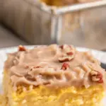An easy scratch-made cake recipe with crushed pineapple and brown sugar topped with a caramel pecan coconut icing perfect for 4th of July and Memorial Day!