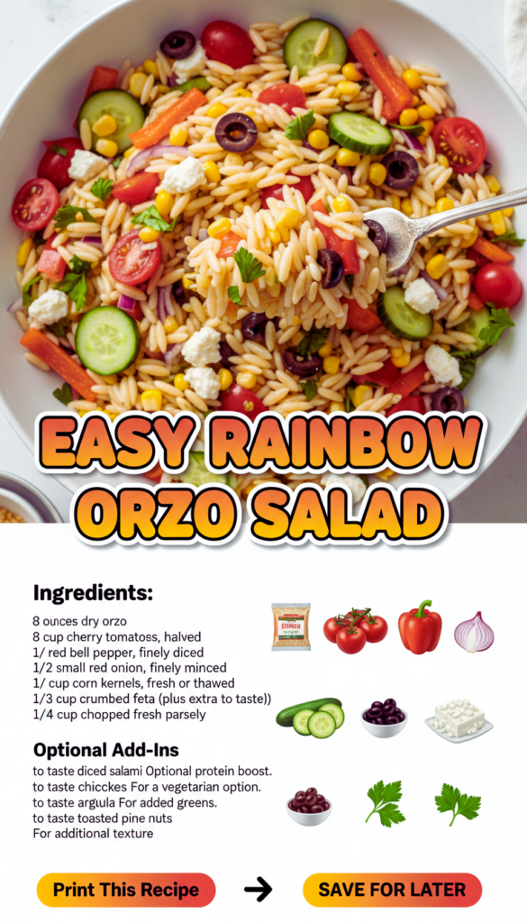 If you’re new to this, don’t worry. The steps are simple and straight from my own kitchen. I’m including a short shopping list and the exact flow I follow every time so you get the same results. This Easy Rainbow Orzo Salad is surprisingly quick to whip up, and it’s easy to scale for a crowd.