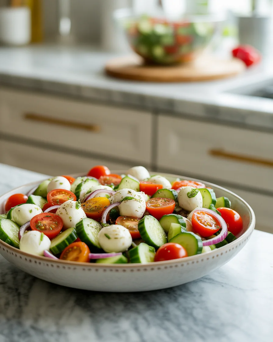 A quick, refreshing salad featuring cucumbers, tomatoes, mozzarella, and basil, perfect for busy weeknights.