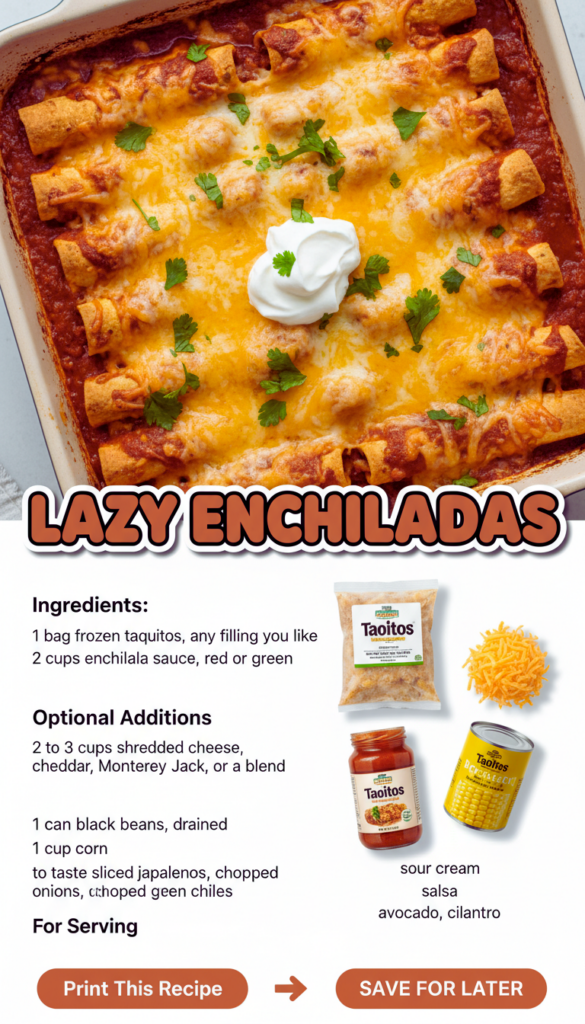 Lazy enchiladas are my go to dinner for those nights when I open the fridge, stare into the abyss, and realize I have exactly zero energy left. You know the vibe: everyone is hungry, you want something warm and cheesy, and you are not trying to roll a single tortilla. This recipe gives you that saucy enchilada comfort without the fussy steps. It is simple, flexible, and honestly kind of fun because it feels like you are getting away with something. If you have a bag of frozen taquitos and a jar of enchilada sauce, you are already halfway there.