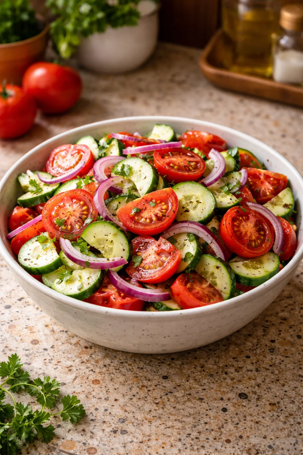 Second, the veggies do the work. Cucumbers bring crunch and coolness, tomatoes bring juiciness, and onions bring that little bite that makes you keep going back for another forkful.