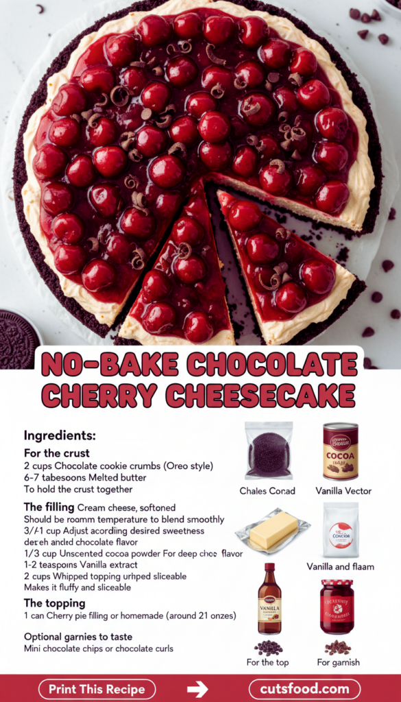 Chill time is not optional. NO-BAKE CHOCOLATE CHERRY CHEESECAKE needs time to set. If you cut it too soon, it will be more like a creamy scoop than a slice. Still delicious, just messy.