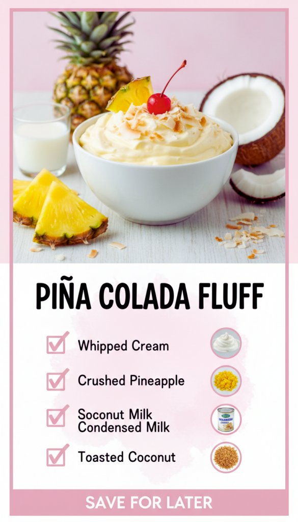 Piña Colada Fluff is what I make when I want something sweet and tropical but I do not want to bake, frost, or stress. You know those days when guests are coming, it is hot outside, and you are standing there thinking, I need a dessert that feels fun and takes five minutes? This is that dessert. It is creamy, pineappley, coconutty, and honestly kind of addictive. I started making it for summer cookouts, and now my family asks for it year round.