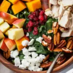 Here’s the part where many folks over-complicate things—or maybe that’s just me before coffee. First, massage the kale. Yep, you heard that right. Get in there and literally rub it down (makes such a difference, or it’ll stay like eating a dried wreath). Toss in your roasted squash, sliced apples, and the cooked chicken. Layer on your nuts, cheese, cranberries, and onions—honestly, just dump ’em in. Pour the vinaigrette all over and toss. It’s not rocket science, but it does feel kind of magical how quick it comes together.