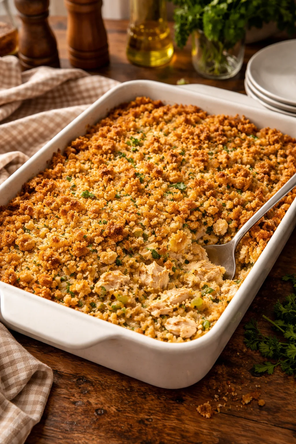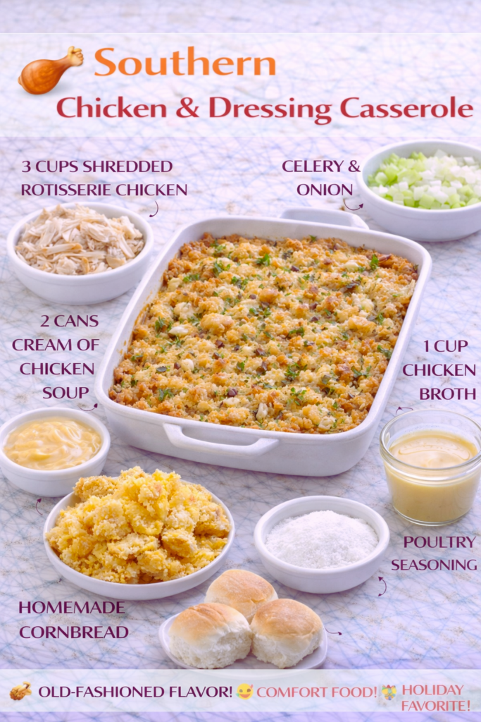 If you are the type who likes a step by step recipe page to reference while you cook, I have one for this exact comfort dish here: chicken and dressing casserole. I keep it straightforward, no weird ingredients, no stress.