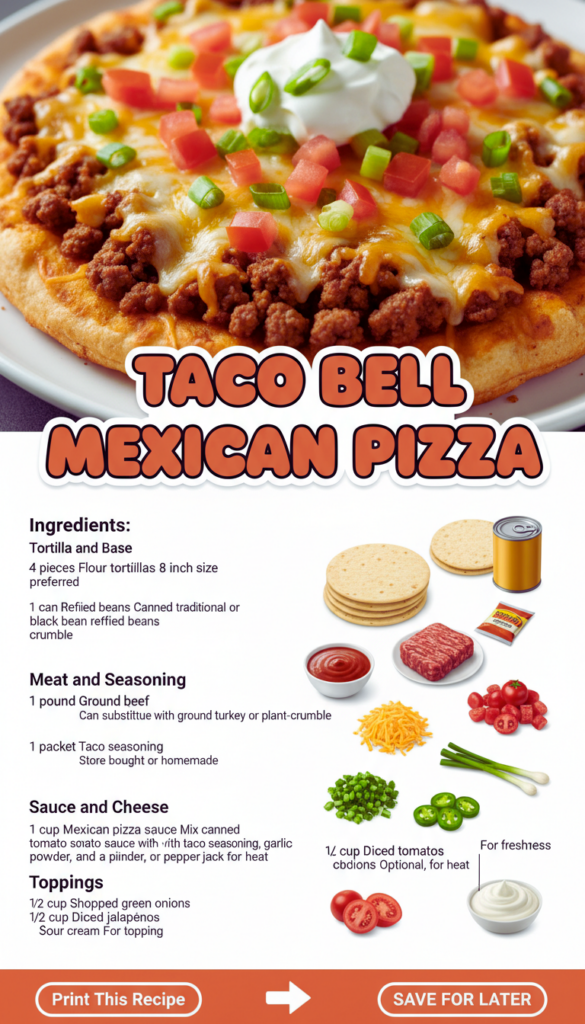 TACO BELL MEXICAN PIZZA is the kind of craving that shows up right when you are tired, hungry, and definitely not in the mood to overthink dinner. I have had those nights where takeout sounds amazing, but I still want something warm and crispy that I can make with what is already in my kitchen. This homemade version hits the same comfort zone with crunchy layers, saucy beans, seasoned beef, and that melty cheese moment on top. It is also easy to tweak for picky eaters, spice lovers, or anyone trying to stretch groceries. If you have been missing that classic flavor, I have you.