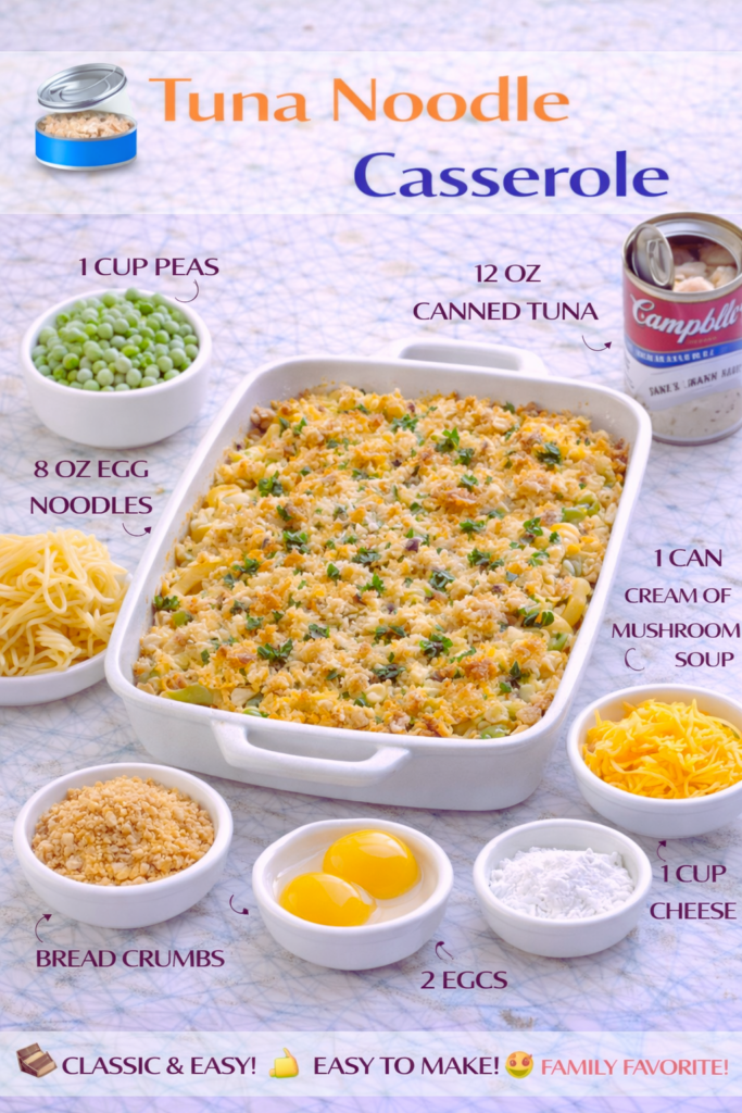 Boil your noodles until they’re just tender, then drain. In a big bowl, stir together the soup, milk, seasonings, tuna, peas, and a handful of cheese. Fold in the noodles. Pour everything into a greased baking dish, top with more cheese, then sprinkle on crackers or breadcrumbs mixed with melted butter. Bake until bubbly and golden on top.