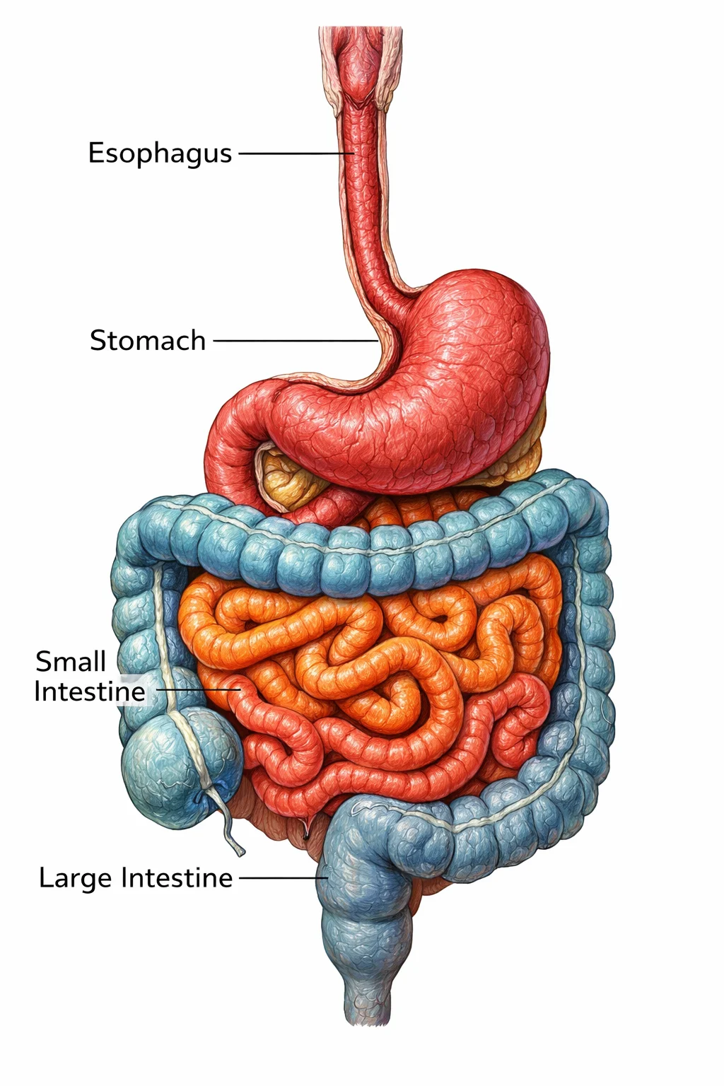 - Main players: Mouth, stomach, small intestines, large intestines, and some backstage folks like the liver and pancreas.